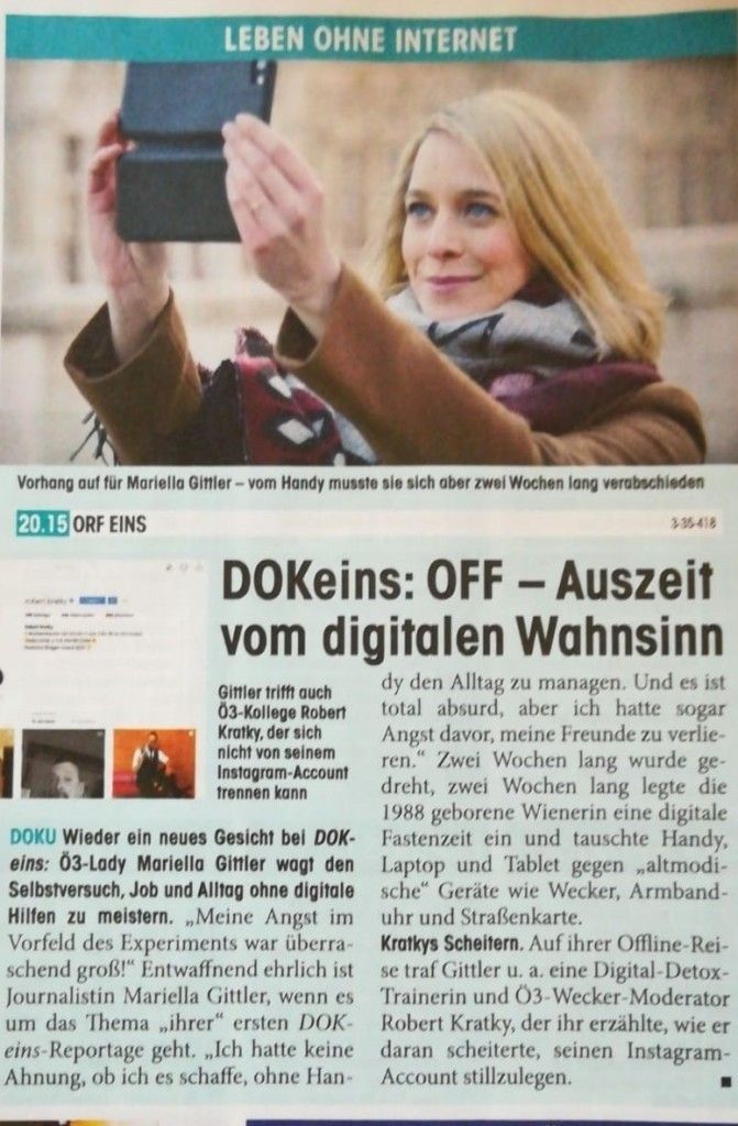 Am 18. April 2019 wurde über den Auszeitplatz ein Bericht mit dem Inhalt .OFF - Auszeit vom Digitalen Wahnsinn"mit Mariella Gittler im OFR1 ausgestrahlt.
